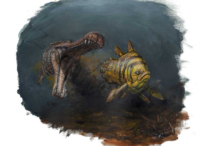 My old #Sarcosuchus and #Mawsonia painting was featured on @AnimalogicShow's latest episode. #paleoart #art #paleontology #crocodile #acrylicpainting #coelacanth