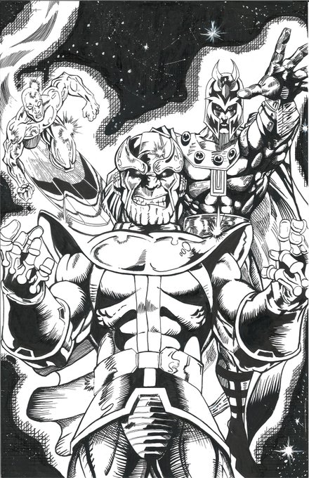Some more fan art done in pen and ink. #ArtistOnTwitter #illustration #Inktober #penandink #crowquill #art #fanart #comicbook #comicbookart #silversurfer #thanos #magneto #marvelfanart #cosmic