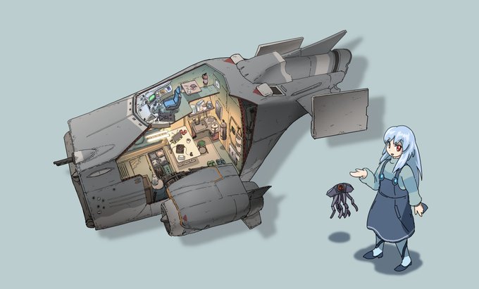宇宙船"Don Quixote" 元はなんと軍の輸送船なんだって! 魔改造に踏み切ったこの宇宙船の持ち主は、@ASP__Ian さんちのリアクターちゃん。 #Commission #Cutaway #イラスト