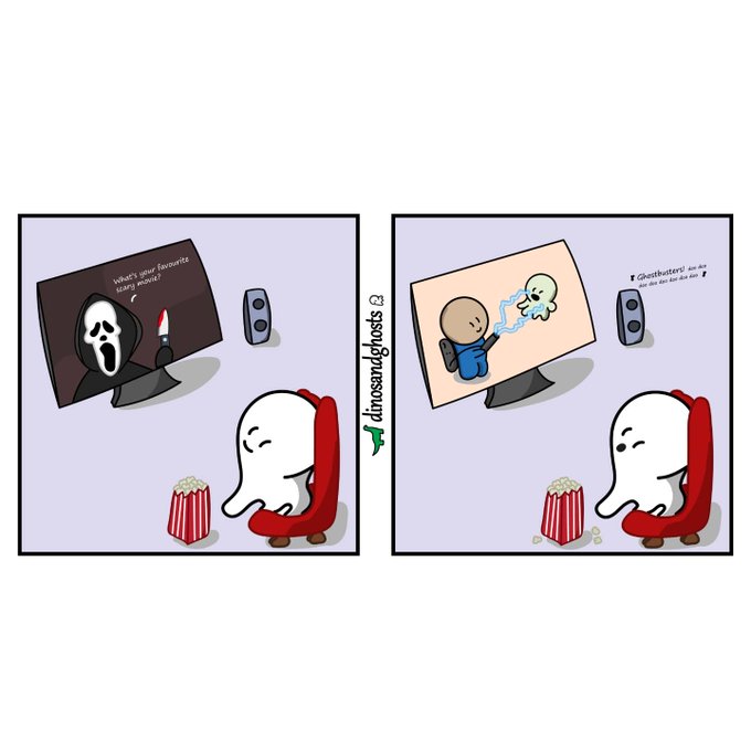 #Spooktober day 20: horror movie Spooky likes scary movies, but some are just too scary... . . #spooky #scarymovie #scream #ghostbusters #webcomics #cute #cutecomics #inktober2021
