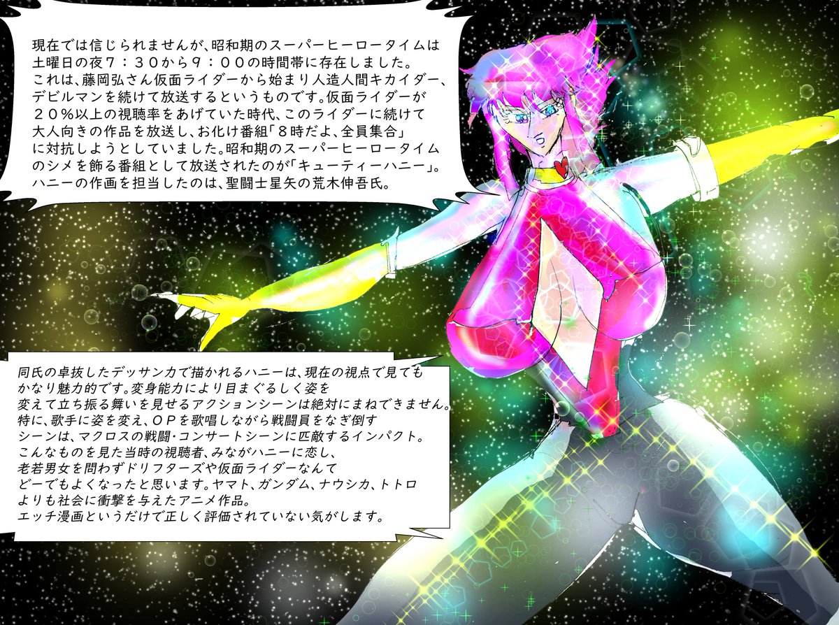 #イラスト基地 #ArtistOnTwitter #絵描きさんと繫がりたい #創作同盟 #イラスト王国 #絵描きの輪 #digitalart #秋の創作クラスタフォロー祭り #みんなで楽しむTwitter展覧会 #アトリエの系譜 #cutyhoney #キューティハニー #ハニー 昭和のスーパーヒーロータイムは土曜夜7:30から9:00!