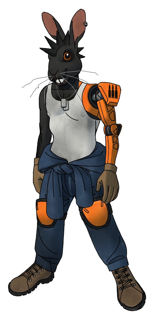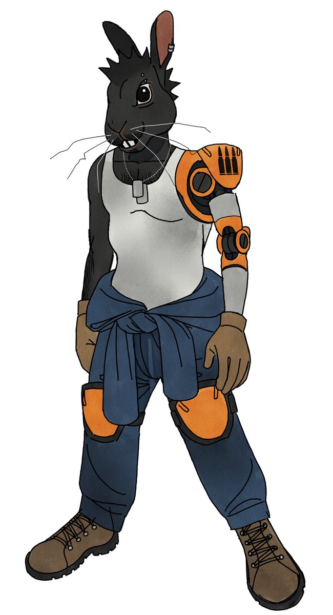 yet ANOTHER ttrpg character—this time, for a space opera cyberpunk game i've got coming up! this lad's name is Gasket, and he's a tech with a love for heavy equipment and even heavier weapons. #dnd #dndart #dndoc #cyberpunk #cyberpunkart #cyberpunkoc #furry #furryart #rabbit