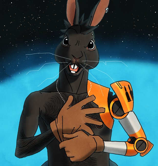 yet ANOTHER ttrpg character—this time, for a space opera cyberpunk game i've got coming up! this lad's name is Gasket, and he's a tech with a love for heavy equipment and even heavier weapons. #dnd #dndart #dndoc #cyberpunk #cyberpunkart #cyberpunkoc #furry #furryart #rabbit