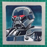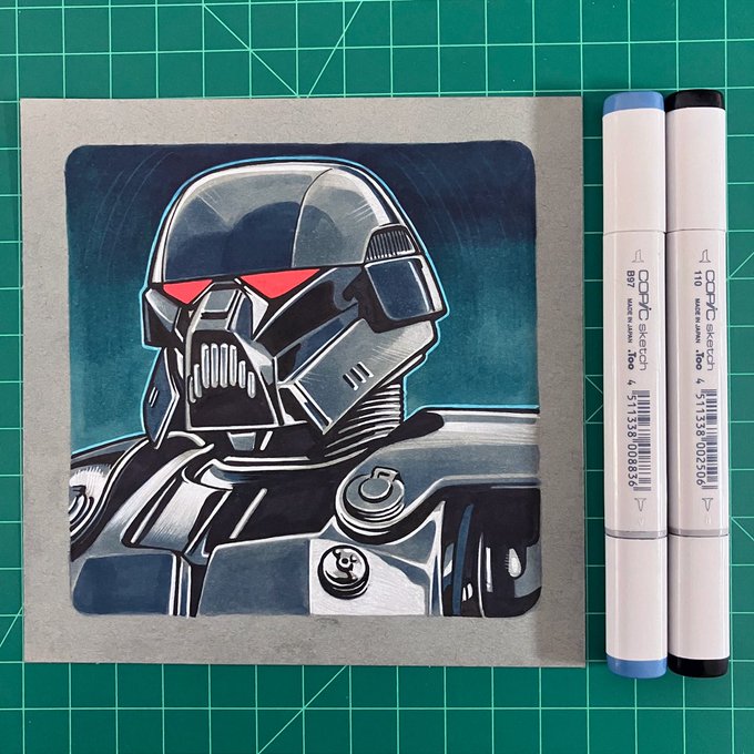 October Art Challenge Day 11: DARK TROOPER From the #darthtober list by @SketchWars Did this one on the Strathmore Toned Blue paper with some highlights using a PITT white brush and red Posca pen. #starwars #starwarsart