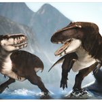 A young Gorgosaurus meets a hungry Daspletosaurus defending its meal. #paleoart #SciArt #Gorgosaurus #Daspletosaurus #Fluvionectes