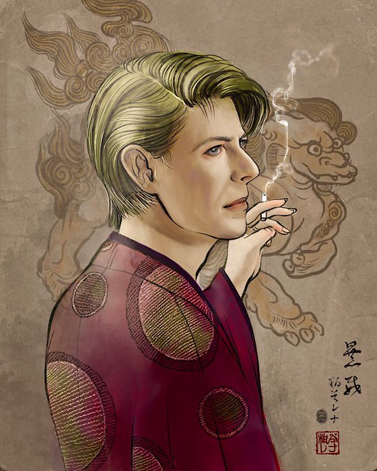 昨日のデッサンからの絵です😊 桃の季節だからね 和のボウイとクールなボウイ😊 ちょっとだけ雰囲気が違ってしまったな😵 #DavidBowie #davidbowieforever #Procreate #ArtistOnTwitter #イラスト