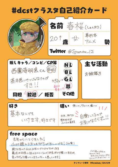 テンプレお借りしました…! レイヤーさん、絵描きさん、小説書きさんect… 色んな方とお話したいです🙌🙌 RT中心に挨拶して回ります〜! dcst語れるおともだち欲しいのでよろしくお願いします…!🙏💕✨ #dcst絵描きさんと繋がりたい #dcst好きさんと繋がりたい #dcstクラスタ自己紹介カード