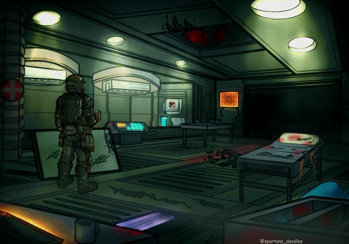 An ODST walking through an abandoned medbay in a lost ship called, The Ishimura... #halo #HaloInfinite #DeadSpace #digitalart #Art #ArtistOnTwitter #digitalpainting #illustrationart #Halloween #spookymonthfanart #xbox #XboxSeriesX #gaming #scary