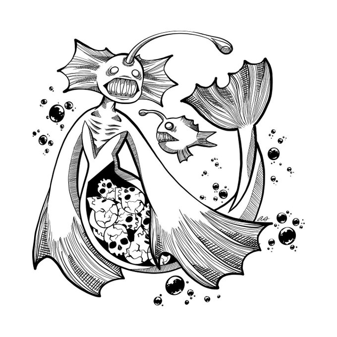 Day 9: Angler Witch! You uh…you may not want to swim too deep. . #inktober #inktober2022 #ink #Angler #anglerfish #deepsea #ocean #creepy #procreate #procreateart #lineart #art #Artists #ArtistOnTwitter #skull #humanskull