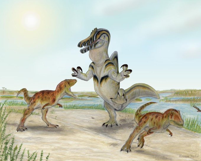 I don’t have many pieces with backgrounds. I really like the results when I do. Something I should expand on... eventually. #dinosaur #talesofkaimere #paleoart #dinosaur #spinosaurus #quetzalcoatlus #deinosuchus