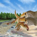 The River King Takes His Due. My latest #Paleoart piece: #Deinosuchus vs. two #Teratophoneus brothers. Cheers to @lukas_wyo! I had an amazing time with this piece. Full story here: deviantart.com/illustratedmen… #Dinosaur #Tyrannosaurus #TugOfWar