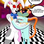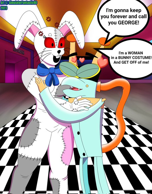 Uh oh. Looks like Delete the bunny lover is at it again. Much to Vanny's annoyance. #FiveNightsAtFreddys #FNAF #fnafsecuritybreach #fnaffanart #Vanny #VannyFNAF #Delete #Cyberchase #PBS #PBSKIDS #Crossover #bunnygirl #bunny #art #ArtistOnTwitter #robot #hugging #costume #rabbit