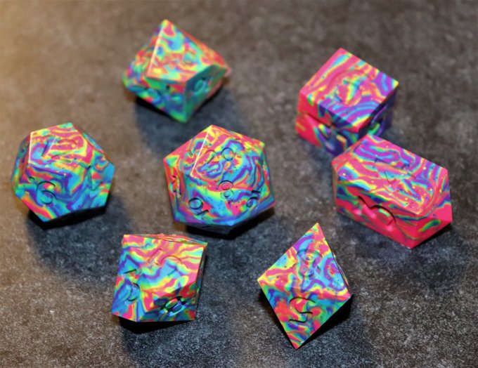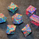 My latest dirty pour, PSYCHEDELIC SAMBA! Demolding vid available in reels! Made with @eyecandypigments and @justresinart pigment paste! This set is a WIP, meaning I still need to sand, polish, and ink them. #dicemaker #ttrpg #handmade #dungeonsanddragons #dndart #dnd #dice