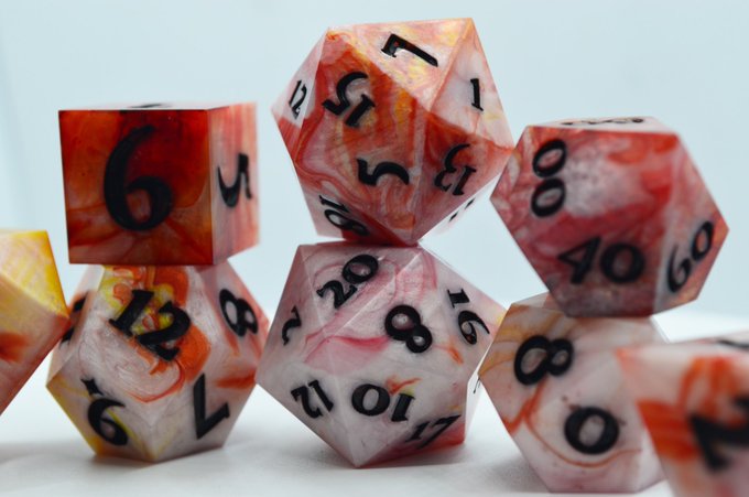 These are so crazy that I ended up inking them a very neutral white. What do you think? I also still need to name them lol #ttrpgfamily #handmadedice #dicemaker #TTRPGs #dndart