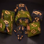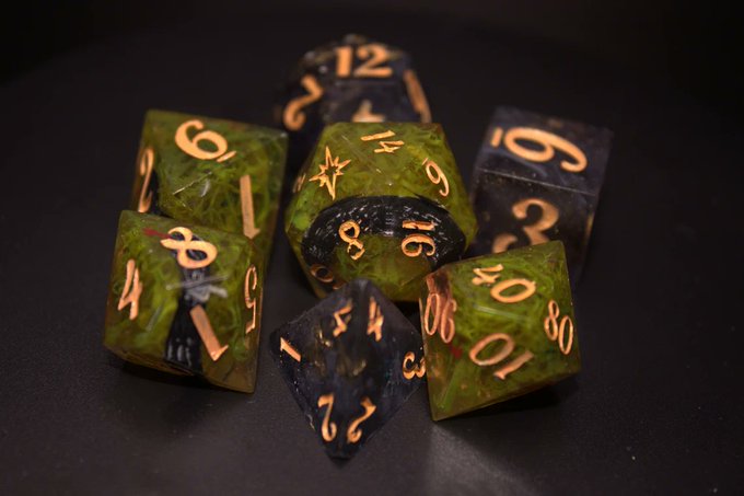 A custom set I made for my new drow peace domain cleric, Max! The campaign he’s in is so amazing & exciting- & we’ve only gotten to play two sessions so far! I’ve loved every second, & really can’t wait to play again💜🌿⭐️ #dndart #dicemaker #ttrpg #dnd #handmadedice #art