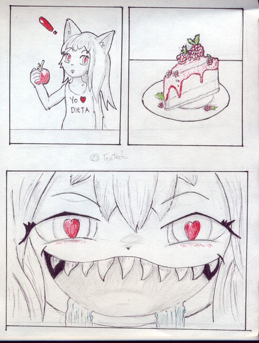 Basado en hechos reales. Inktober día 25 - Tentador/Tempting #inktober #inktober2022 #tempting #tentador #ink #kemono #cat #gato #furry #furryart #cheesecake #pay #diet #dieta #traditionalart #dibujotradicional #red #rojo