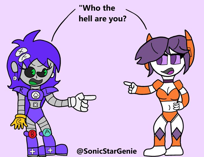 The two robot gals, Cube-Rina and Vade meet at last in person.....in a rather funny greeting, lol (LIKES/RTS APPRECIATED ❤️♻️) #OC #ArtistOnTwitter #Artwork #digialart