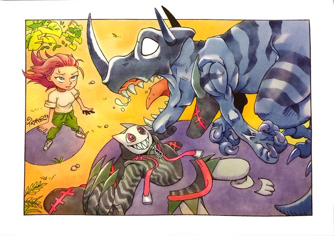 (>>OPEN COMMISSION_DM please!<<) @Ursidae89 Commissioned me a rampaging Greymon (Blue) getting surprised by her OC Digimon: Lurkmon! and her tamer Hayley as bait! #デジモン #digimon #lurkmon #hayley #originalcharacter #digimonworld #taragraphika #commission #digimonfanart #OC