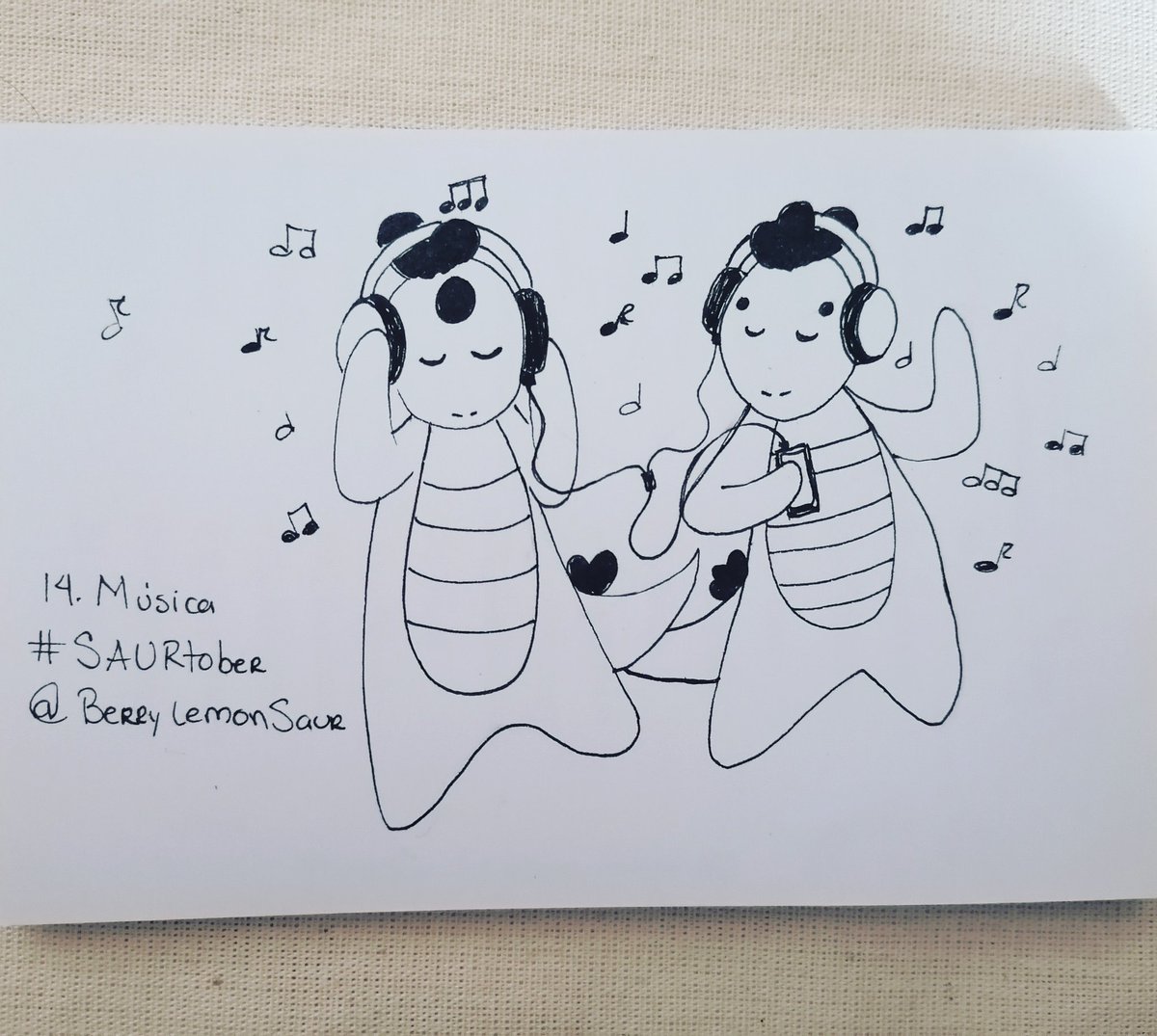 Día 14 del #SAURtober Música 🎶🎵🎶🎧 . . @BerryLemonSaur . #BerryLemonSaur #SAURtober #Inktober #drawing #ink #dinodrawing #traditionalart #inktober2022 #inkart #inking #inkdrawing