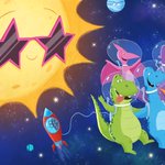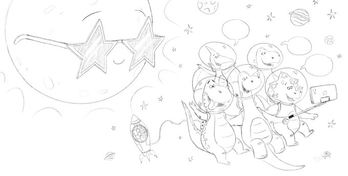 Sketch and final artwork - one of my favorite spreads from Dinos In Space, written by Ashley Matthews.🦖🦕☀️😎 #kidlitart #kidlit #picturebook #dinos #illustrationart