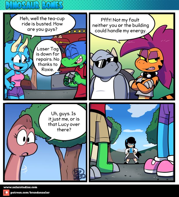 The escapades in the park continue! This time Roxie's taking Zarland and Bruce into her element. #dinosaurbones #webcomic #comic