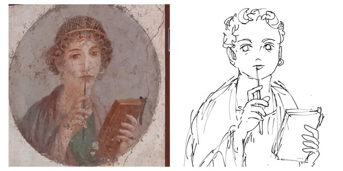 ポンペイ展に行ったときの写真を見返していたら思わず描いてしまった落書き 女性が持っているのは本ではなくて板に蝋を引いたメモ帳(書字板=タブレット 二つ折タイプだとディプティク)と引っ掻いて書く尖筆(スタイラス) アジラフェルも使ってたと思うんです #GoodOmensFanArt #diptych