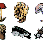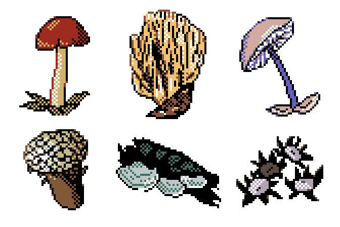 🍄A well-rounded team of six #mushroom sprites. In the style of pokemon gold/silver. #dithering #pixelart #2bit (#Hygrocybe, #Artomyces, #Entoloma, #Calvatia, #Trichaptum, #Astraeus)