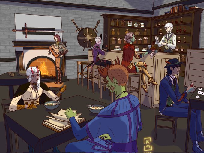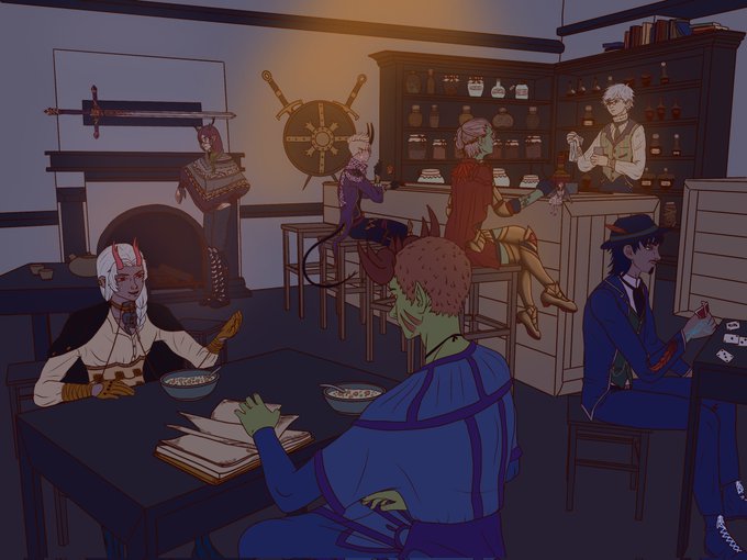 I wasn't happy with the lighting so I went back and hand shaded everything. Tada! Catch us on Wednesday's on @KoiKosmic twitch channel for the next chapter of outlr adventure! #groupshot #dndart #dndgroup #dndcharacter #dndgroupshot #procreate #procreateart #tavern
