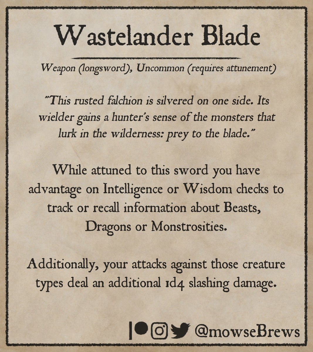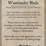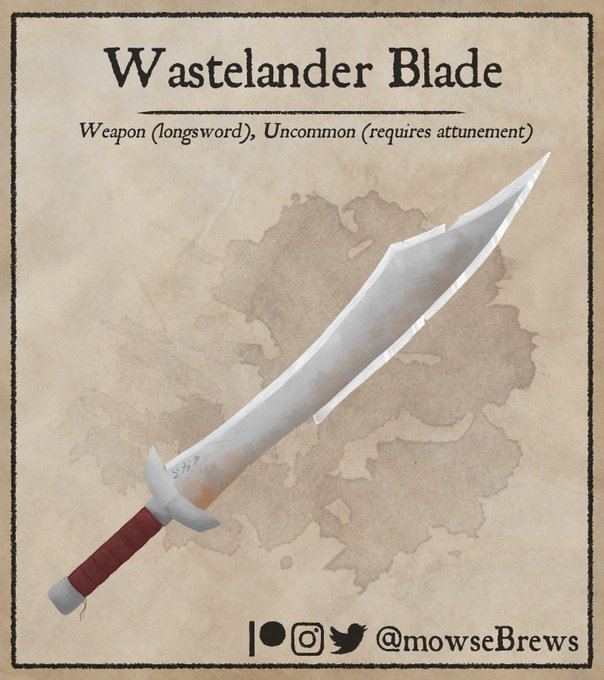 My flavourful take on the Waste Hunter Blade, one of my favourite items from #Criticalrole S2! This is a repost, making the patreon exclusive bits public. One-sided item card, art and unwatermarked links below - all free! #dnd #dndart #dndhomebrew #dnd5e #ttrpg