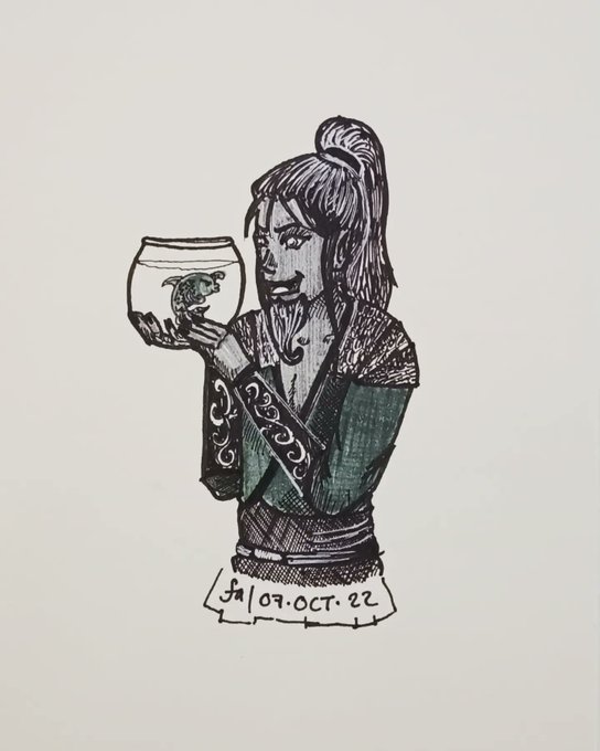 Día 07 del #orctubre2022 Marman y Paty la Lámpara "Quisiera ser un pez / para tocar mi nariz en tu pecera / y hacer burbujas de amor por donde quiera" #dndart #inkdrawing #faestudioarte #ilustracionmexicana #tirandorol #tintubre2022 #dndmexico #traditionalart #fantasyart