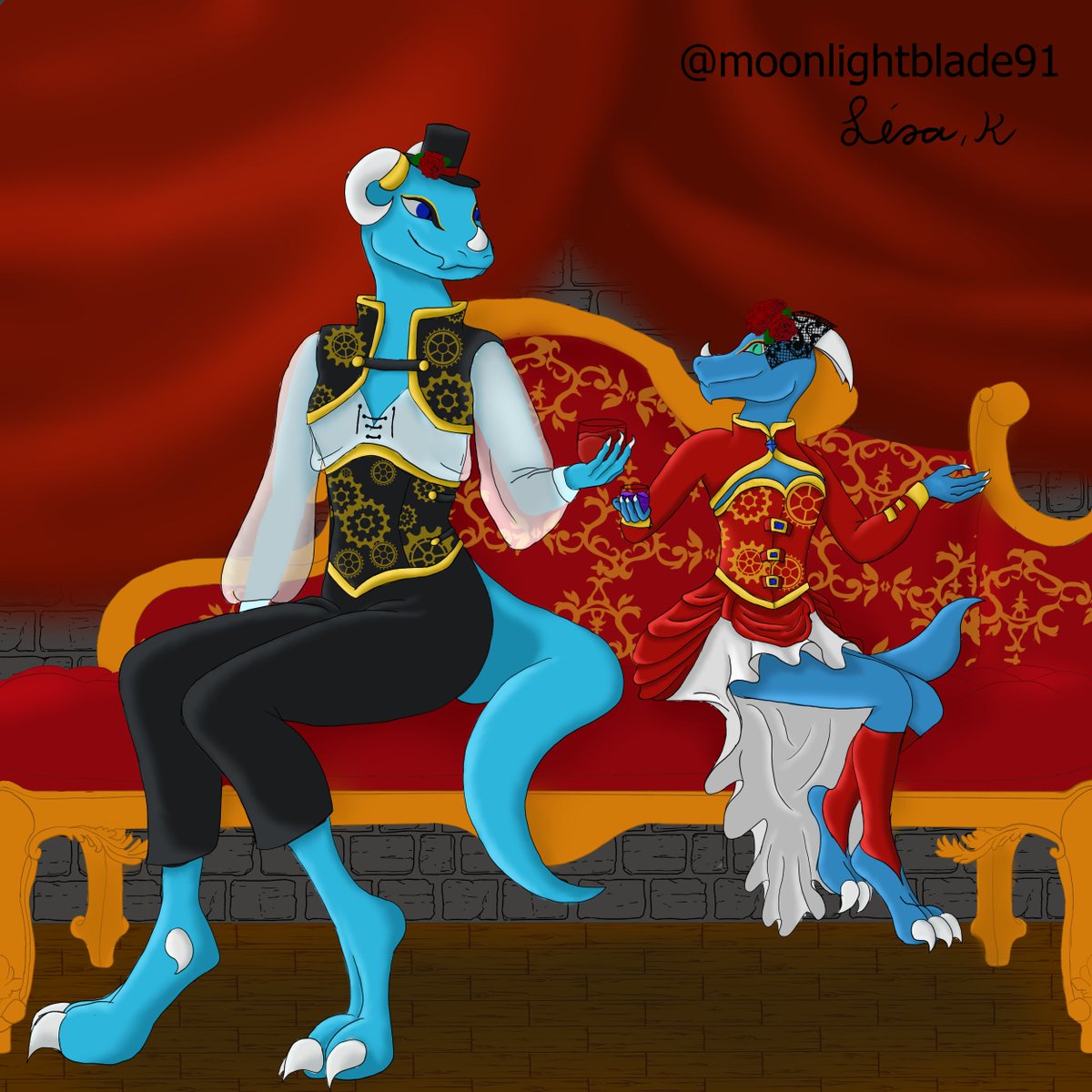 Here we have the second of my #Halloween drawings. here is my #dragonborn #dndbard Aurora (left) and her mother my #kobold #dndranger/bard Sagittarius (both she/her) (right) in #steampunk outfits. enjoying the evening. #dnd #dnd5e #dndart #artwork #scaly #digitaldrawing
