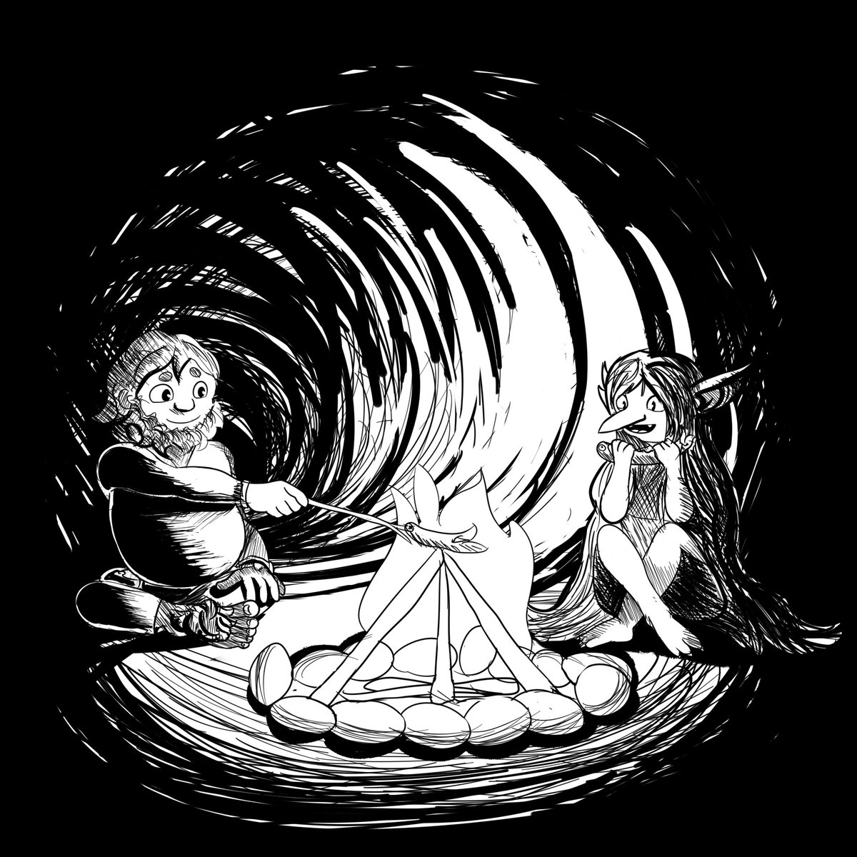 Prompt #2: Goblin The halfling's second encounter was thankfully pleasant as he encountered a friendly goblin who offered him her share of fish. Looks could be deceiving, after all... #dndrawtober2022 #Inktober #drawtober #DnD
