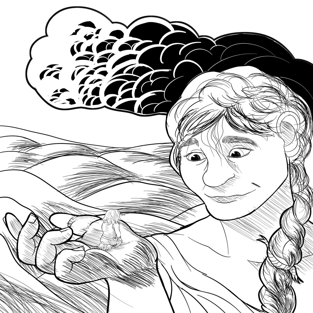 Prompt #6: Giant A giantess took great interest in the halfling. Where did he come from? What was his quest? Why were his feet so hairy? She carried him closer to his destination as he regaled her with his past tales. #dndrawtober2022 #Inktober #drawtober #DnD