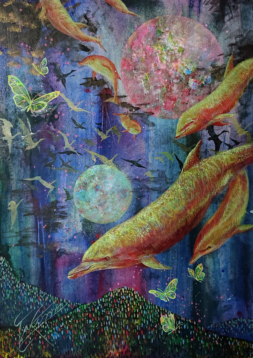Into The Blue .. Alcohol Inks and Windsor and Newton ink #art #artistsontwitter #contemporaryartist #Dolphins #painting