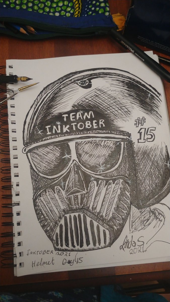 #inktober2021 #inktober2021day15 holy fuck I hated today's prompt: Helmet. I discarded three ideas and when I saw a kid's BMX bike helmet I had my final idea. I almost gave up completely. But I didn't. #inktober2021helmet #ArtistsofTwitter #done