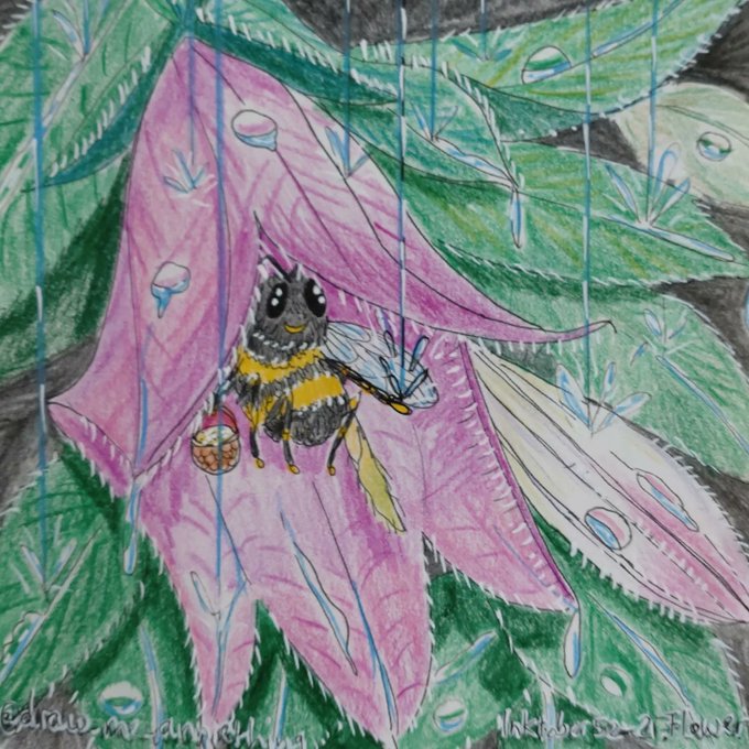 After weeks of black and white, this week's prompt of @inktober called for colour, so I complied! #drawme - 21. Flower #flower #nettleleavedbellflower #bellflower #campanula #rain #bumblebee #inktober #inktober2022 #inktober52 #inktober52_flower #inktoberallyearlong