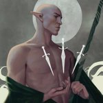 I never got around to posting the finished edgey egg, did I? Have some Solas goodness for your afternoon, friends. 🔥💛🔥 #solas #dragonage #dreadwolf #dragonageinquisition #fanart #inkart #inktober #tarot #videogameart