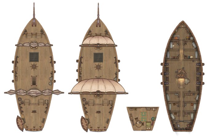 Finished up my ship map. Added below deck, captain's room etc. I plan to do a map of it at sea but I think I'm done with the ship itself for now. Made (I think exclusively this time) with assets from Crosshead. #DnD #TTRPG #Battlemaps #Map #dungeondraft #dndart