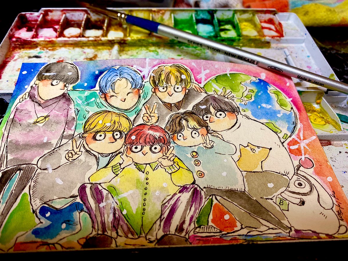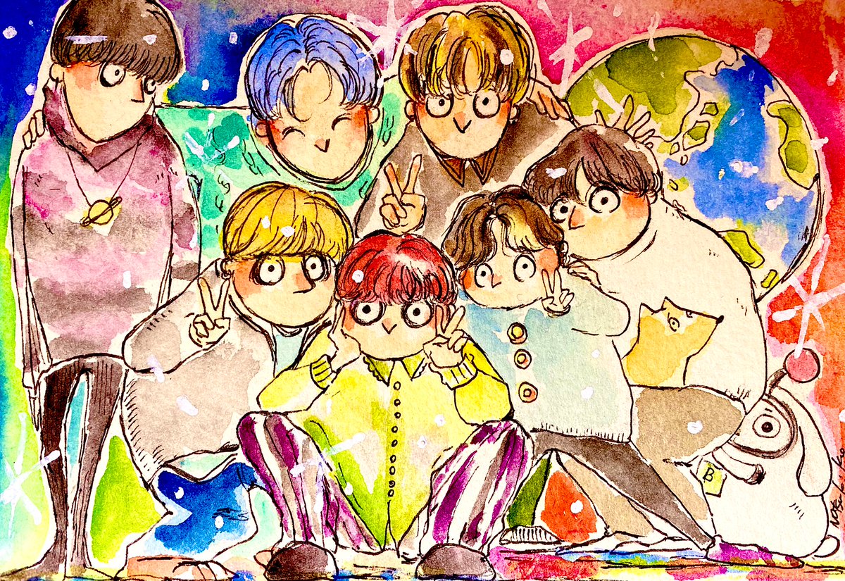 #ORβITファンアート企画 絶対かっこいい絵を描くんだ!と構図を色々考えたけど… んー、結局7人揃ってて楽しそうにしてる姿に落ち着きました🌈🪐 そして…タイトルをつけるなら「ハナ」だなぁ💫🌎 「どこにいても1人じゃないよひとつさ」 ☝️🌼🌸大好きですー! #ORβIT #EaRTH
