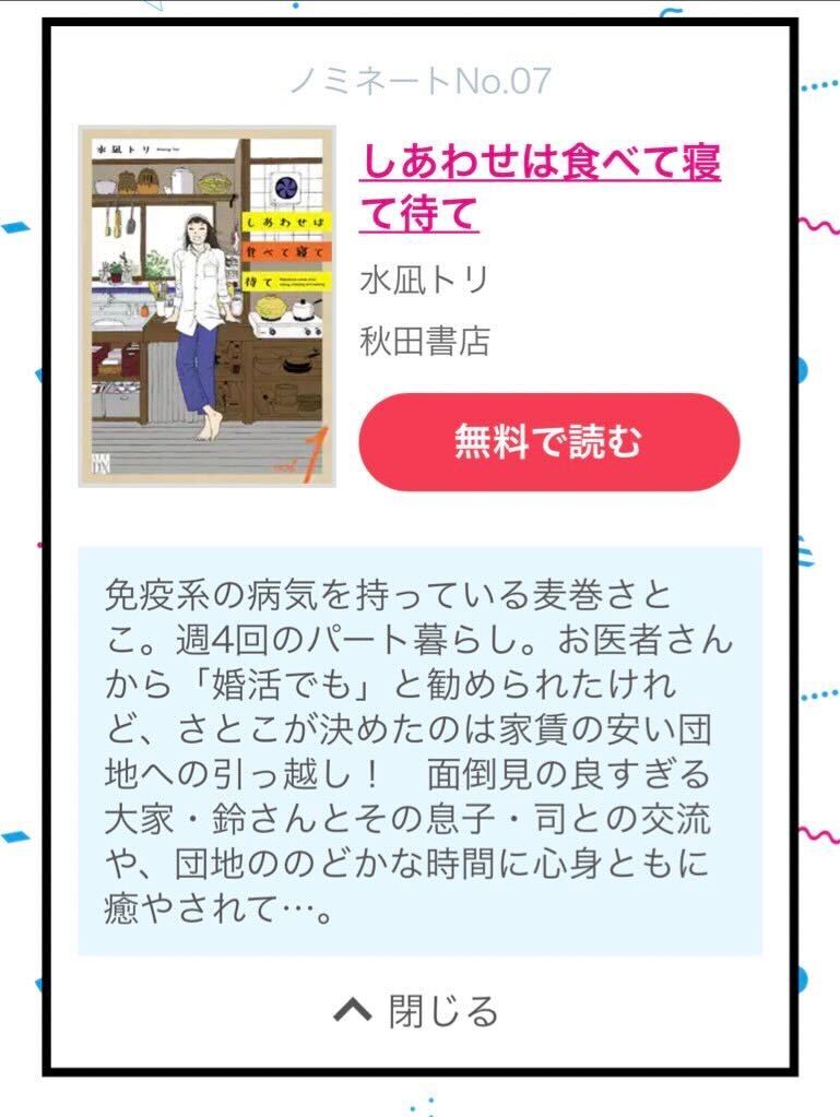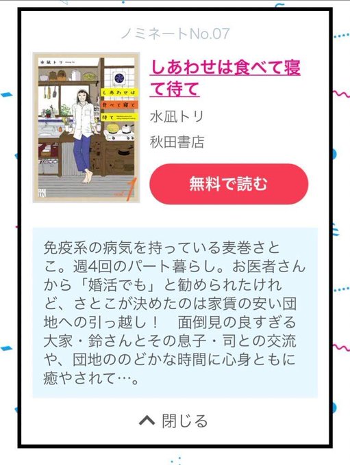 #ebookjapanマンガ大賞 に 「しあわせは食べて寝て待て」が ノミネートされています㊗️🎉 今なら、なんと1巻まるごと 無料で読めます!!✨ 投票で大賞が選ばれるようです。 投票はこちら↓から。 ebookjapan.yahoo.co.jp/content/ebookj… みなさまの応援、よろしくお願いいたします!(担) twitter.com/ebookjapan/sta…