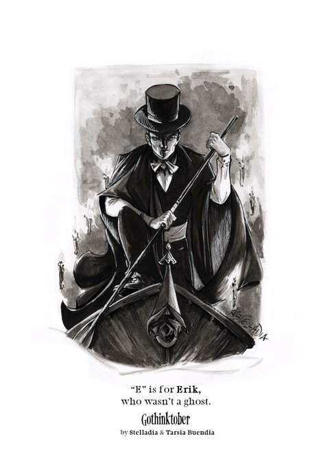 Gothinktober Day 5: “E” is for Erik, the Phantom of the Opera. Art by me, words by @TarsiaBuendia . Original soon for sale. #gothinktober #inktober #gothic #edwardgorey #phantomoftheopera #theatre