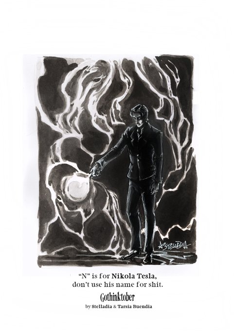 Gothinktober Day 15: “N" is for Nikola Tesla. Art by me, words by @TarsiaBuendia Original soon for sale! 🖤 If you live in Madrid, there's an exhibition currently at @CaixaForum #gothinktober #inktober #gothic #edwardgorey #science #ciencia #tesla #nikolatesla