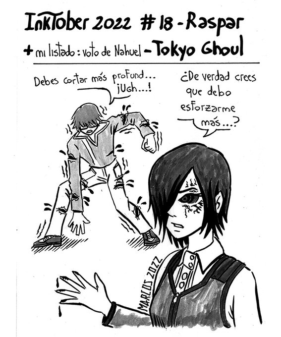 Inktober 2022 - Día 18: raspar. Combiné el tema del día con el voto de mi coequiper Nahuel Nieto, que pidió un dibujo de Tokyo Ghoul. Que lo disfruten! #inktober #inktober2022 #elpinceldemarcos #ink #tinta #tokyoghoul #toukakirishima #drawing