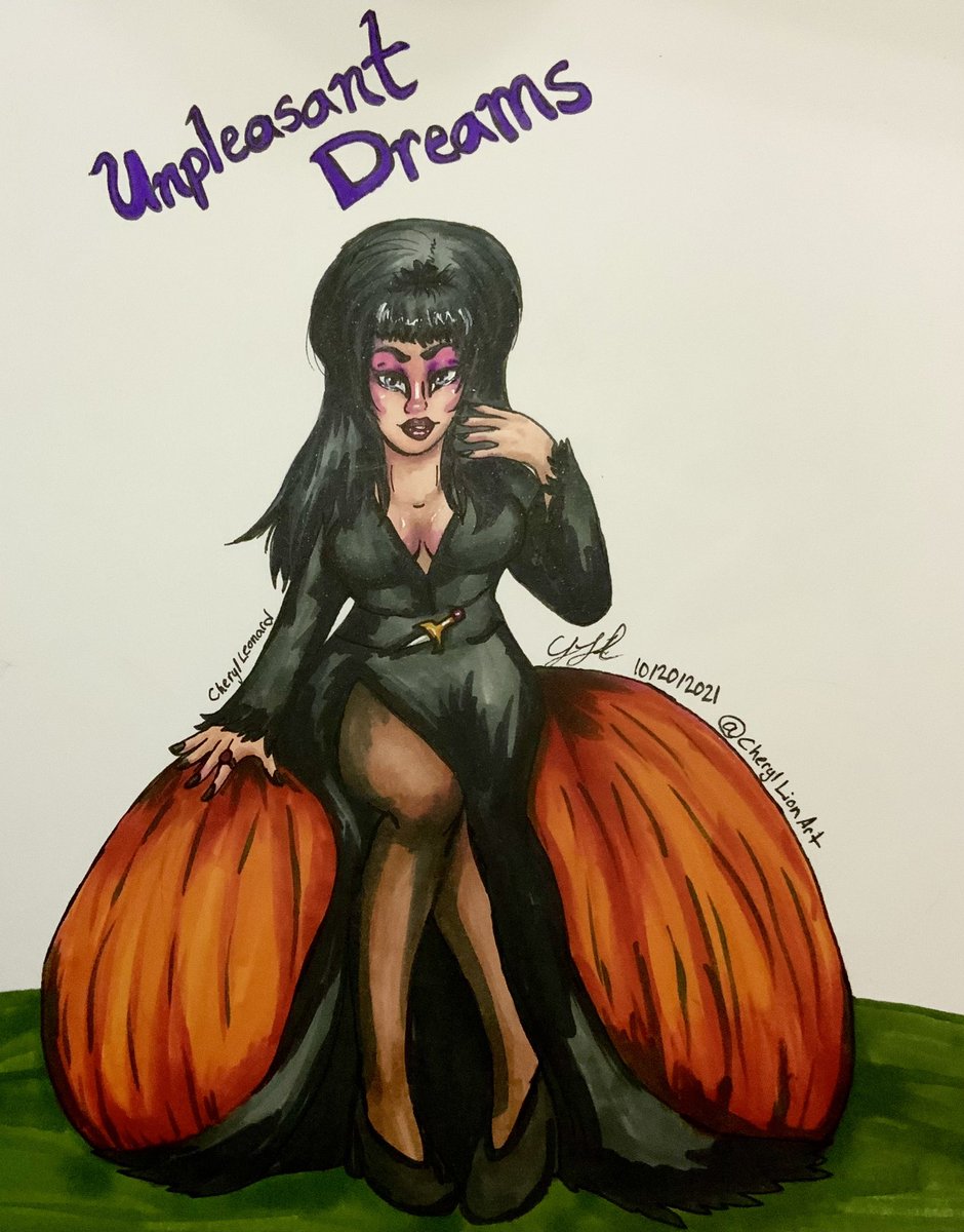 “Unpleasant Dreams” An Elvira doodle. #artistsontwitter #artistsoftwitter #halloween #elvira #inktober #inktober2021 #drawtober #drawlloween #fanart #elviraart