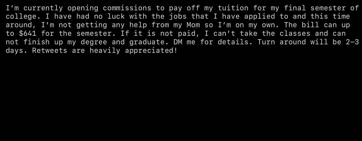 RTs appreciated Hey everyone! I’m opening commission to help pay for college tuition this month to finish off my degree this fall. Any help is appreciated! You can DM me or order here: ko-fi.com/regrah/commiss… #commissionsopen #emergencycommission #artistsontwitter