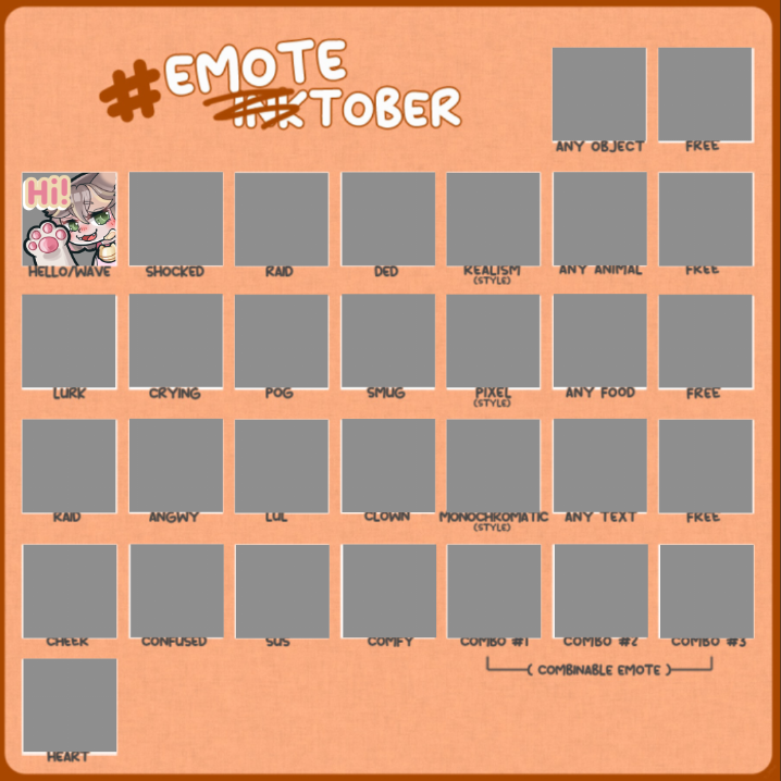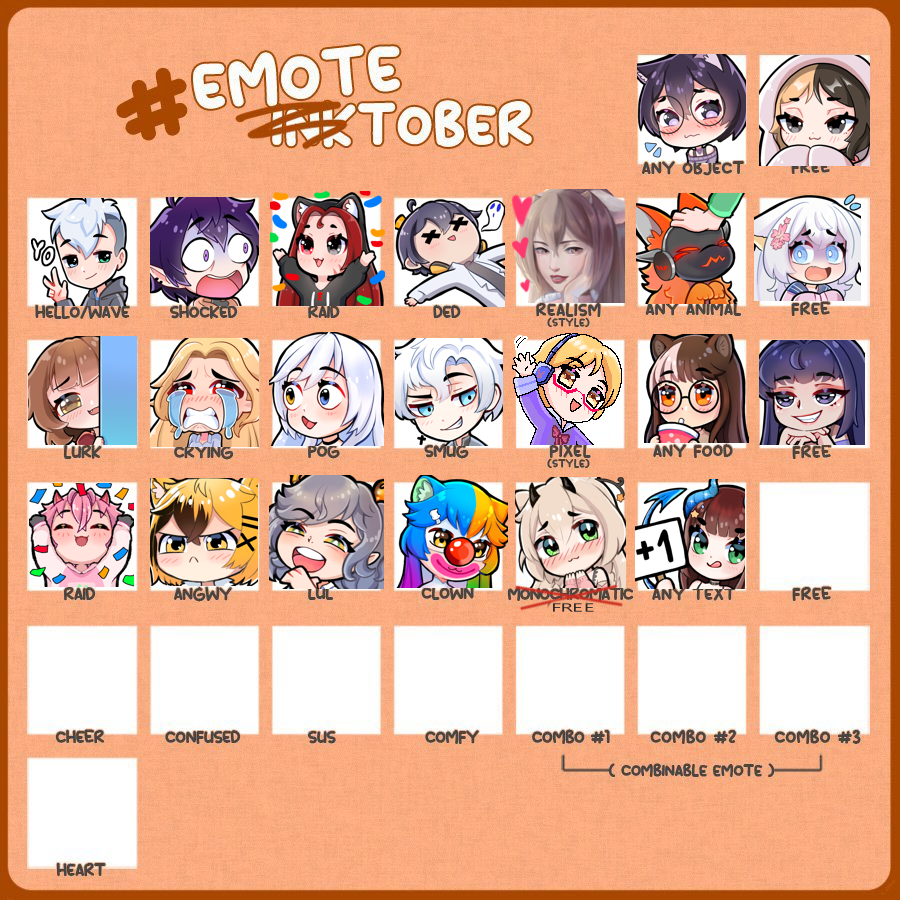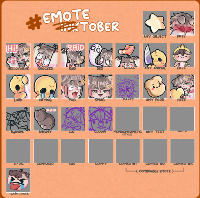 ich hab dank @Lobelia_Erinea diese tolle Emotetober liste von @/__bbbell gesehen und hab beschlossen endlich meine emotes zu updaten c: fange zwar etwas spät an aber ich zieh durch 🐣💛 #inktober #emotetober