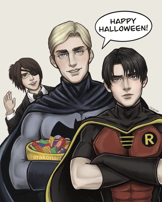 Erwin, Levi and Hange dressed as Batman, Robin, and Alfred. Happy Halloween!!! 🎃 #Halloween #halloween2021 #AttackOnTitan #attackontitanfanart #fanart #aot #levi #leviackerman #hange #erwin #ErwinSmith #batman #robin #art