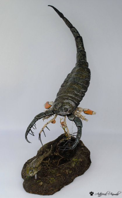Mixopterus kiaeri was a medium-sized predatory eurypterid from Norwey (Silurian). In this sculpture Mixopterus is trying to catch an Ateleaspis. #eurypterid #Mixopterus #paleoart