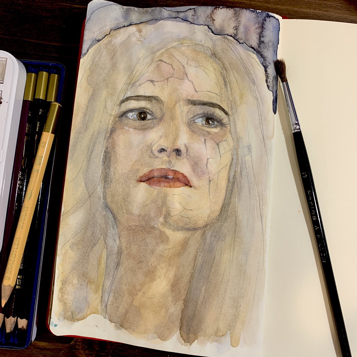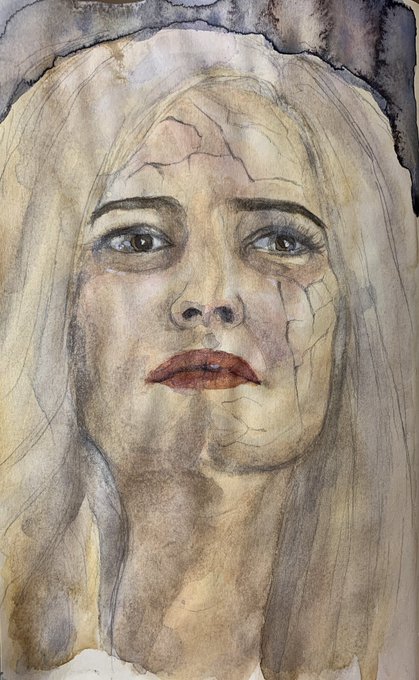 #フォロワー500記念企画 LOLLYGAGさんよりリクエスト、エバ・グリーンさん完成です🥰入りきらなくて生首みたいになっちゃった笑 エバさんの美しい骨格とか顔のひび割れとか描くのめちゃくちゃ楽しかったです😚💖 LOLLYGAGさんありがとうございました❣️#エバ・グリーン #evagreen #DarkShadows #水彩画
