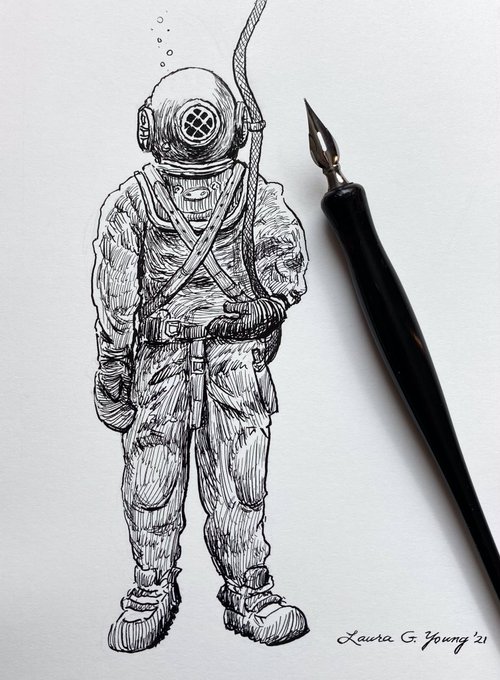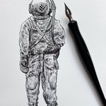 I’ve never worn one of these heavy duty “standard diving” suits, though. I’m sure it’s an interesting experience! #inktober #inktober2021 #inktober2021suit #crowquill #hunt512nib #penandink #diving #exploration #blackandwhite